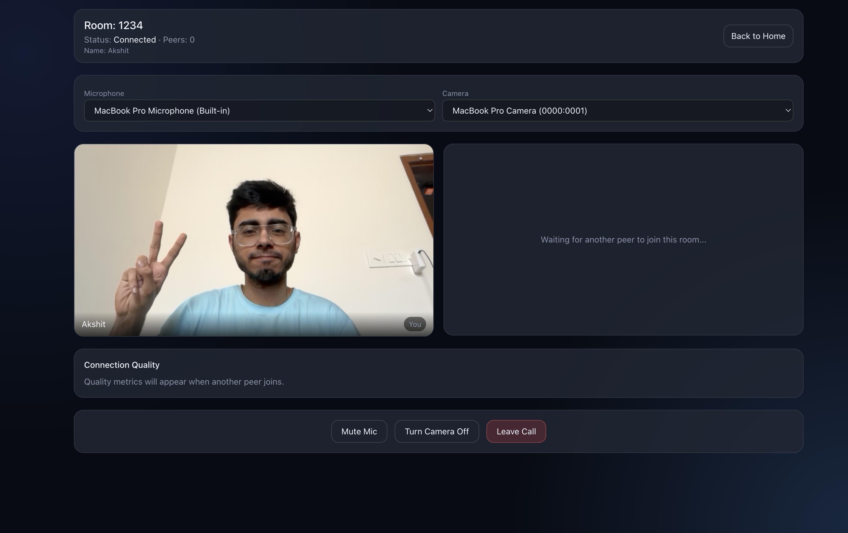 Our implementation uses mesh topology — every peer connects directly to every other peer. For a room of N peers, each peer maintains N-1 peer connections and sends N-1 copies of their media stream.